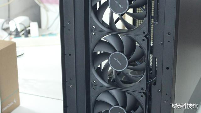 前方 3 把 120mm 静蝠风扇,镰刀形扇叶切割空气时几乎静音,28.8CFM 的风量足够把显卡和主板的热量卷走;后方排气风扇转速稳定在 1500RPM,热空气被及时排出,形成高效对流。最妙的是底部那把反向进气风扇,专门给显卡背板和电源 “吹冷气”,实测比普通机箱降温 7℃,就算在游戏里连续炸掉三个油罐车,显卡也不会因为过热掉帧。